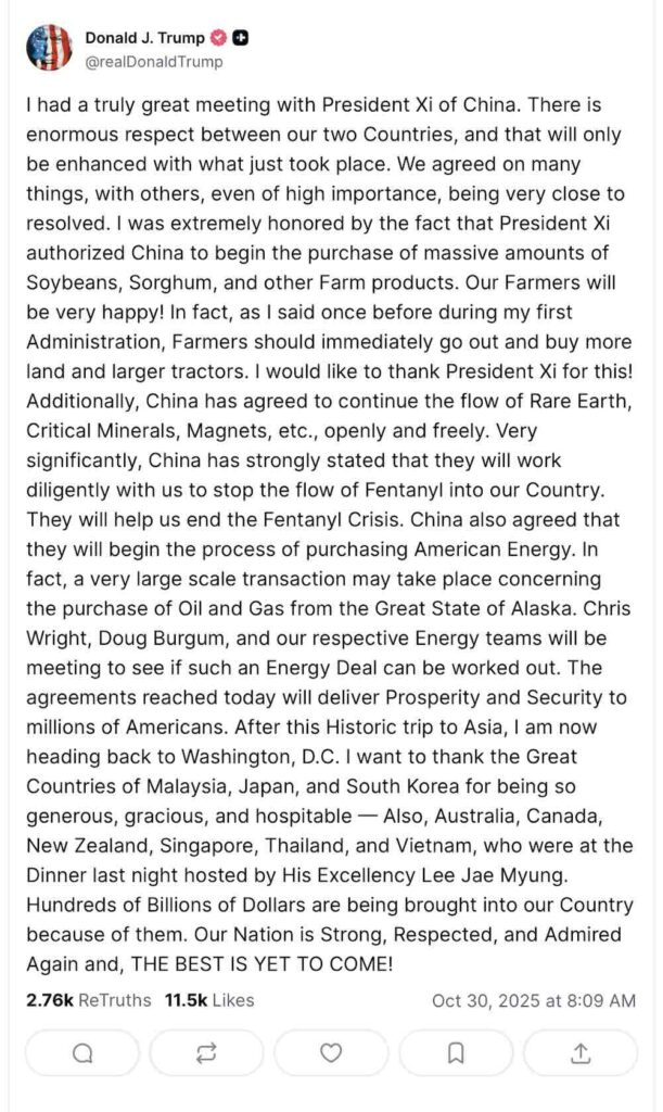 President Trump makes an offer he thinks no-one can refuse on Truth Social at 1.04am, 30 October 2025.